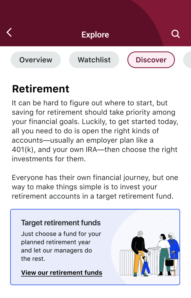 In the end, we created a research-backed, legal-compliance-approved, empathetic experience for new investors that guides them through a number of concepts so they can get started: where and how to invest, the importance of diversification, and the distinction and connection between investment account types and investment products. Everything they need to get started (even the best of user experiences can only do so much with the complexity of finance).