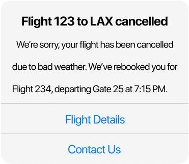 Write a message from the airline app notifying them of the cancellation and what they need to do next.