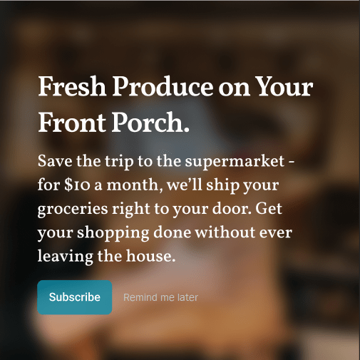 Write a promotional home screen for a subscription service that delivers groceries to the user once-a-month for a flat fee.