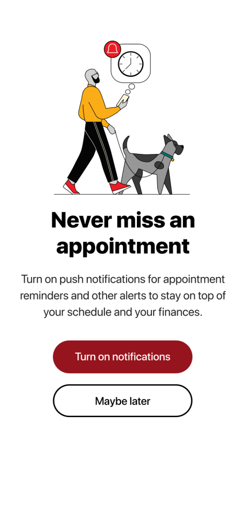 Encourage users to turn on push notifications for the Vanguard app. Technical constraints mean push notifications are “all-or-nothing”: if you turn on push for appointments, you’ll also be turning on push notifications for everything else. We also don’t want to bug the user with constant requests to turn on push.