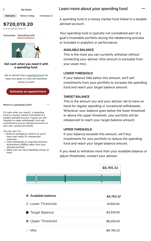 Explain to Vanguard Personal Advisor clients the concept of a “spending fund,” a feature that allows them to withdraw from or contribute to accounts that usually only their advisors have access to. Explanations of how a spending fund actually works have confused clients in user research sessions (and our own team at times).