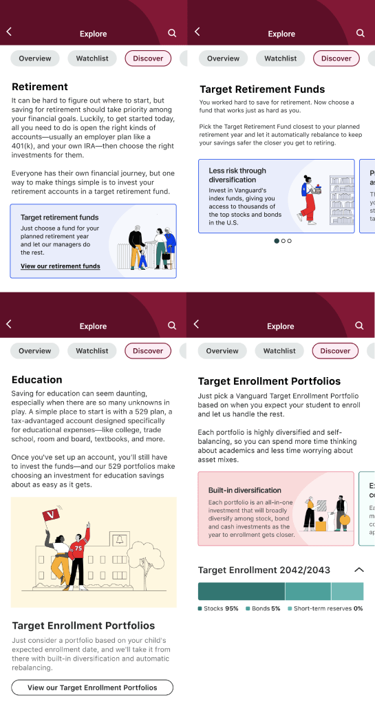 After significant user testing and studying up on personal finance best practices, flesh out two main browse experiences: Browse by product type (mutual funds, ETFs, etc. – not pictured) and Browse by goal (retirement, education, emergency fund).